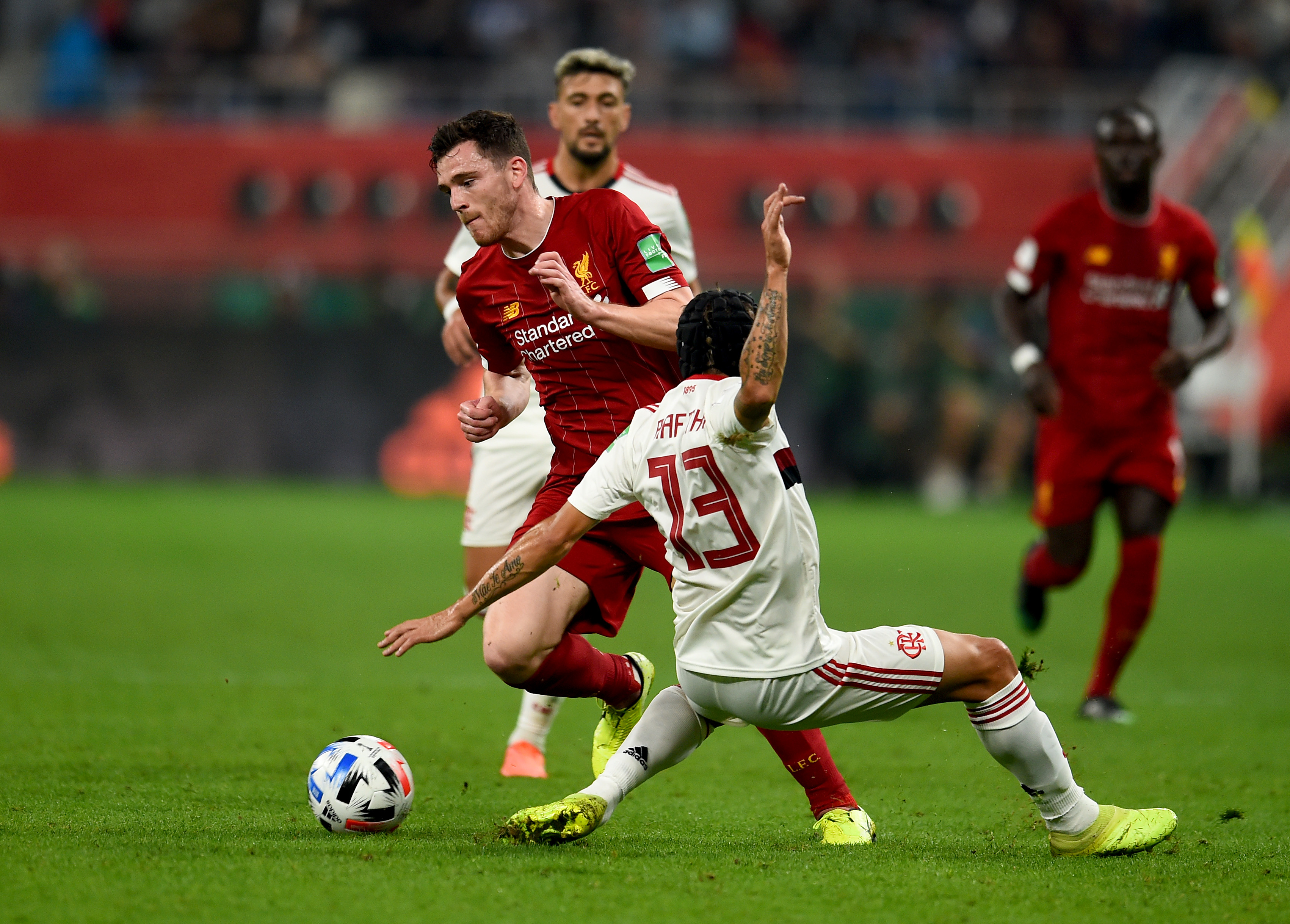 En el minuto 25 fue el Flamengo quien tuvo una buena oportunidad para tomar la iniciativa, pero el tiro de Bruno Henrique fue bloqueado por Joe Gomez, quien disputó un gran partido. Pese al dominio inicial del Liverpool, el Flamengo terminó la primera mitad dando mejores sensaciones.