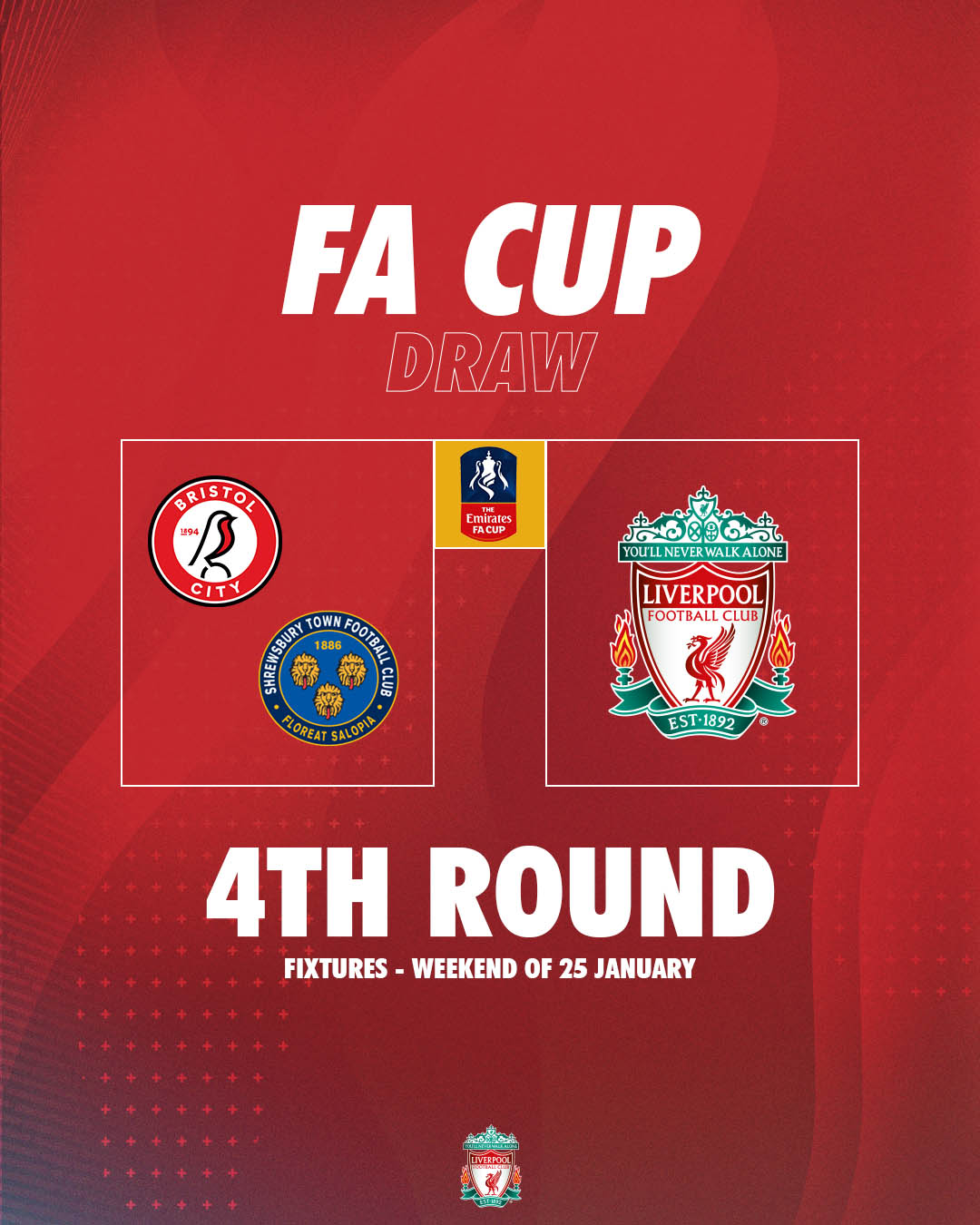 Tras vencer al Everton en la tercera ronda de la FA Cup, al Liverpool le tocará medirse contra un equipo de menor categoría. En efecto, el sorteo correspondiente a la cuarta ronda le ha emparejado con el ganador del Bristol City (2ª división) - Shrewsbury Town (3ª división).