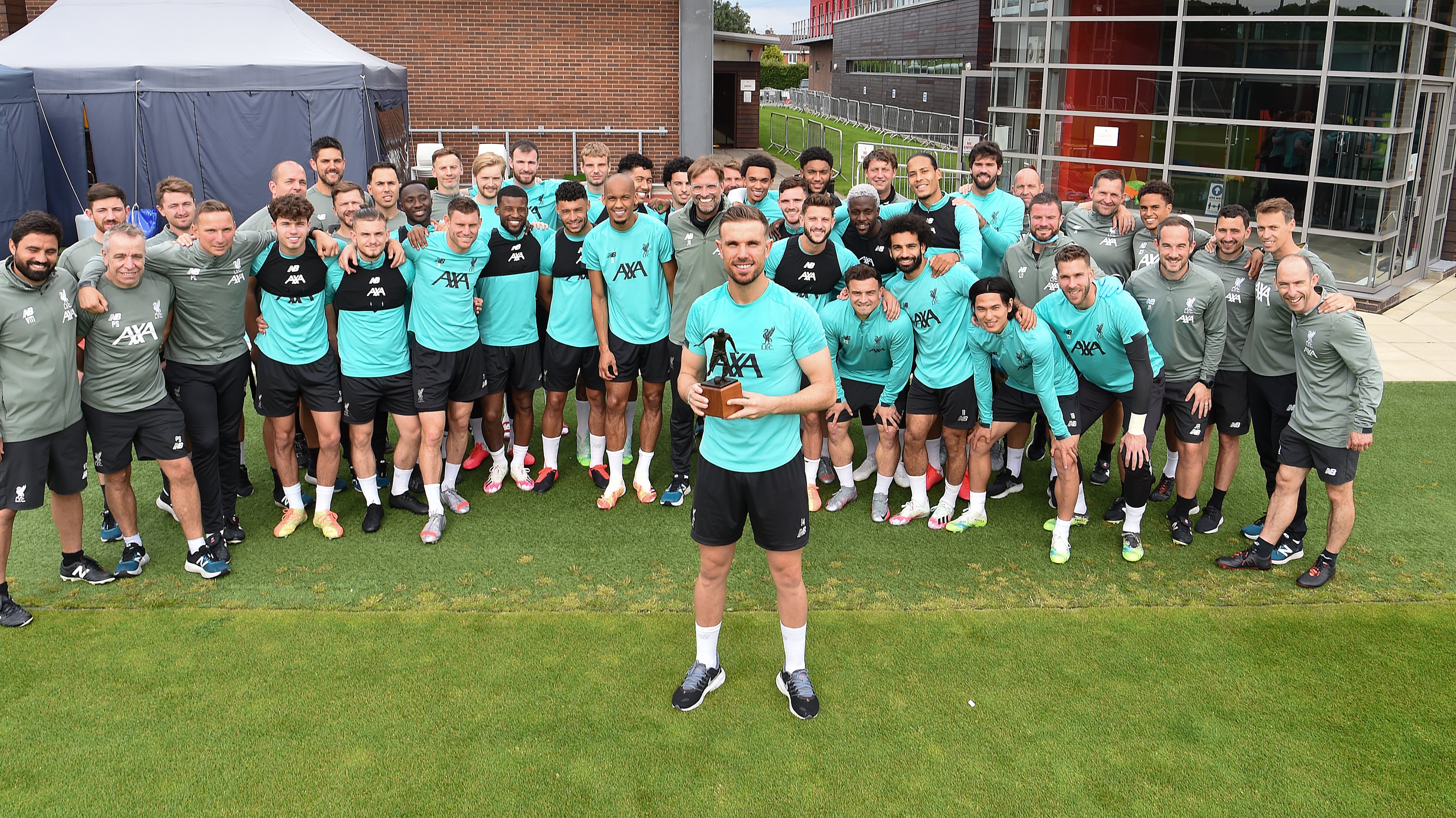 | Henderson posa con el premio en el entrenamiento del equipo FUENTE: LIVERPOOL FC |