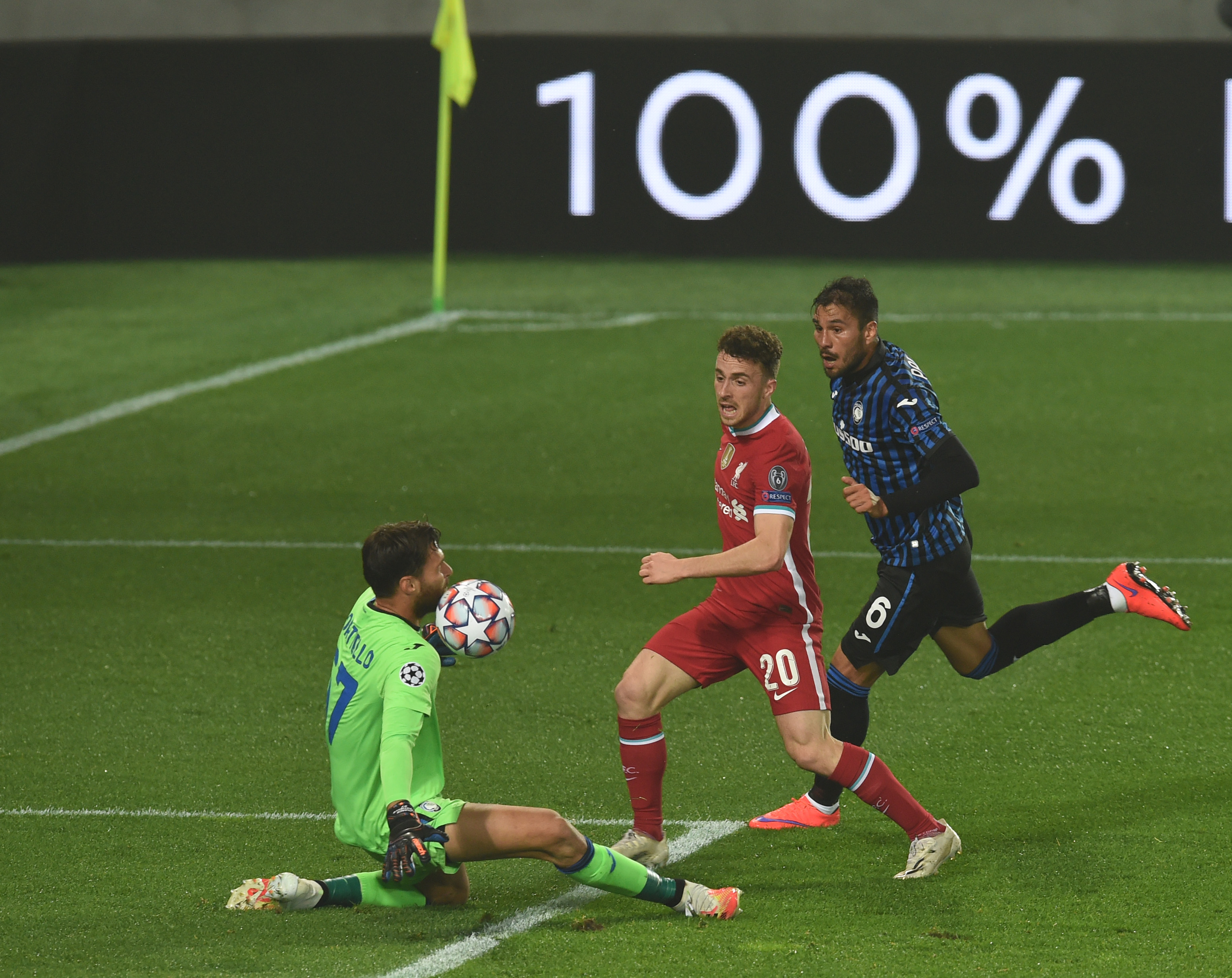 En el minuto 16 por fin se abrió la lata gracias a una impecable definición de Diogo Jota ante Sportiello. Cuatro goles en los últimos cuatro partidos para el portugués. En el minuto 28 un tiro de Zapata dio en el larguero tras tocar en el pie de Alexander-Arnold. En el minuto 33 Diogo Jota recibió en el área un pase largo de Joe Gomez. Su control fue excelente y remató a puerta para marcar el 0 a 2.